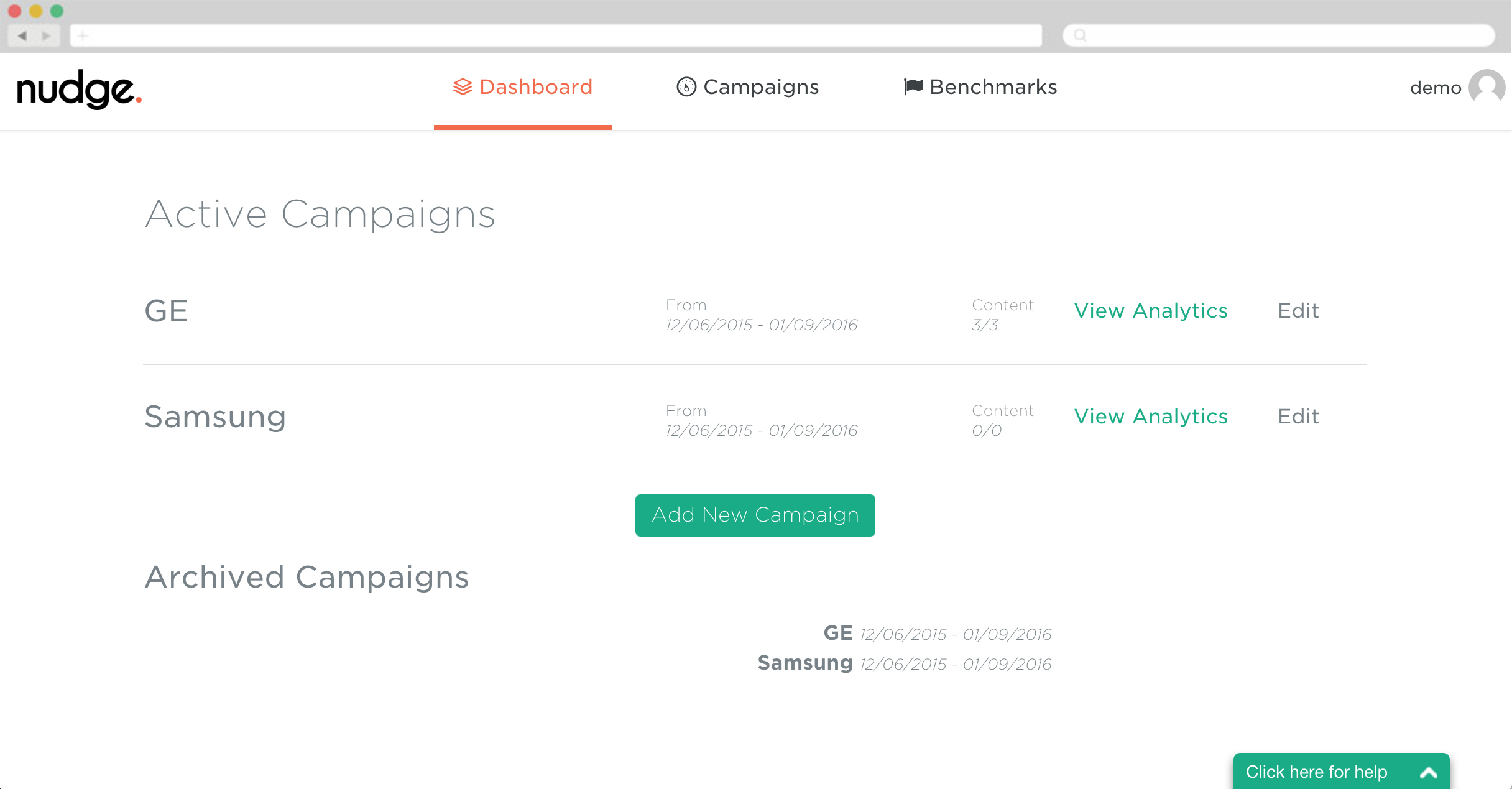 Log in to Nudge, add your campaign, and assign content to it. This lets you build the campaign up, for either Account Managers or clients to log in and see it.