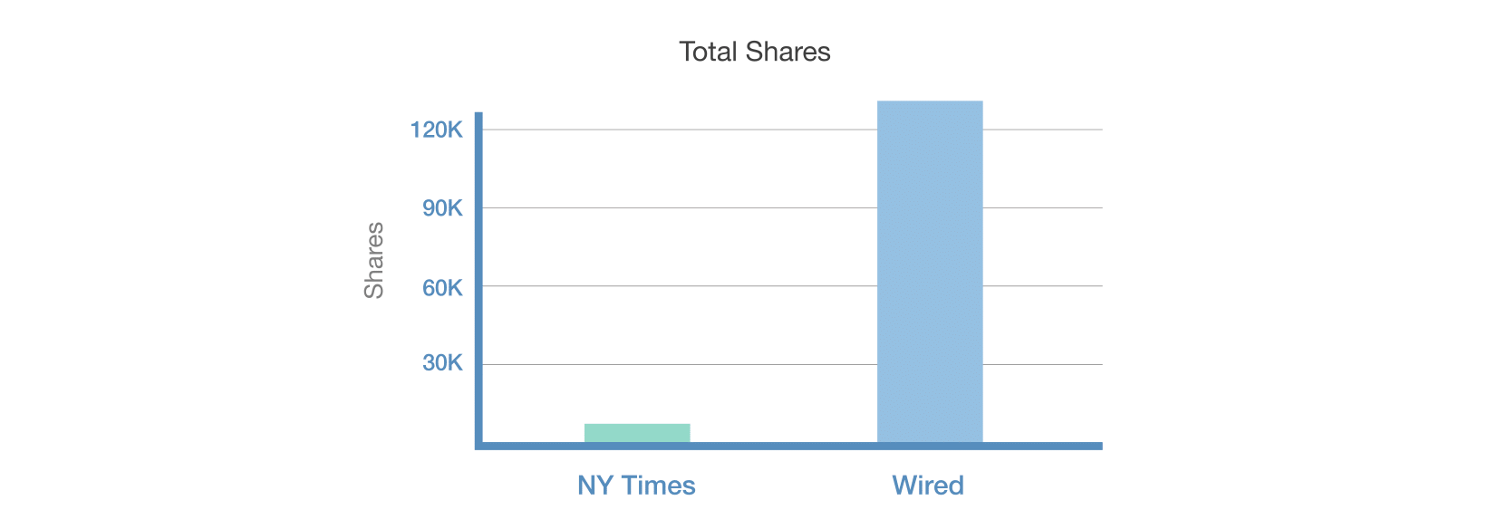 Although we cannot measure engagement directly, we can make some predictions and estimations. Given the larger audience size of the New York Times (Quantcast data suggests 16.9 million/month as compared to 1.5 million/month for Wired), we would expect more traffic there, meaning that with the same volume of shares, we would anticipate a lower rate of engagement when compared to Wired. However without first-party data we are only able to speculate. If this was indeed the case, a strong argument could be made for Wired delivering a greater return on investment.