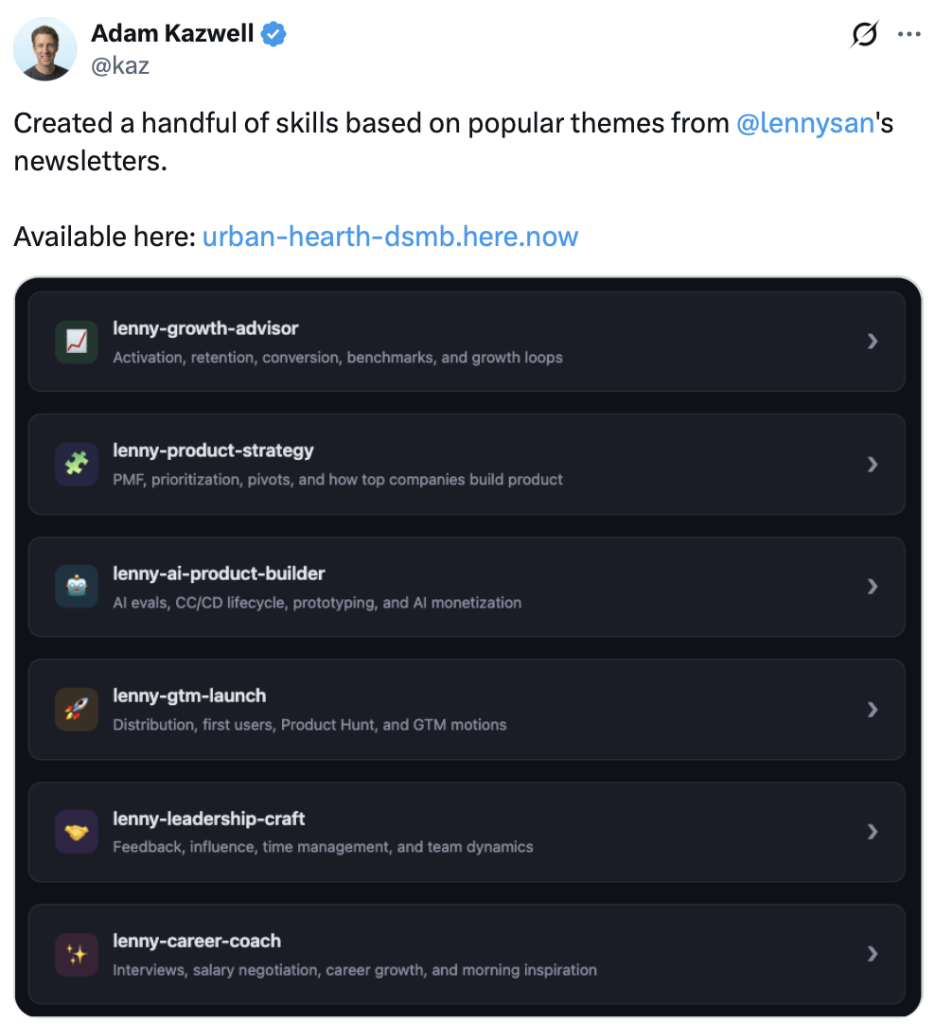 Letting people build on top like Lenny has (and the AI companies though) is exactly the right strategy, to let builders, express their taste, using the skills.