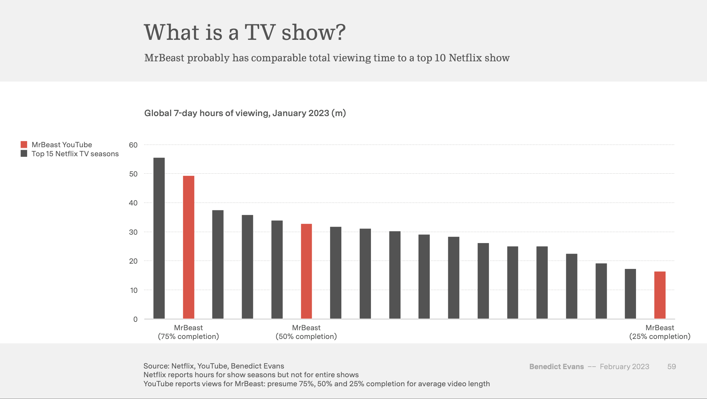 Benedict Evans released his latest report, and put this in for MrBeast, YouTube along tv viewing times, making the argument that he might be one of the biggest shows.