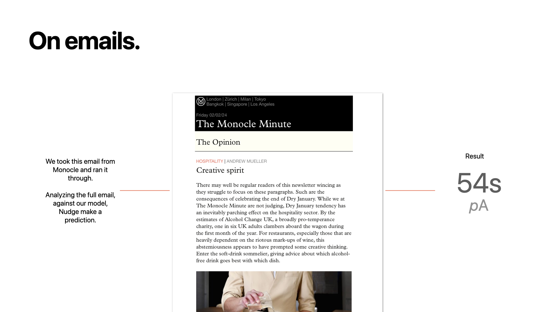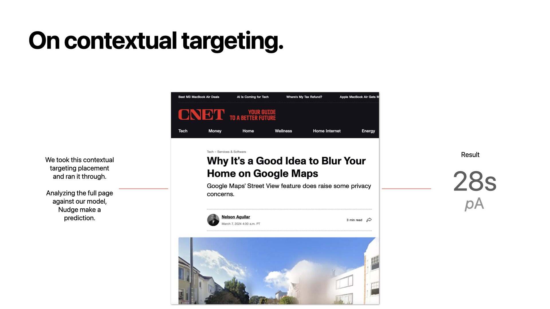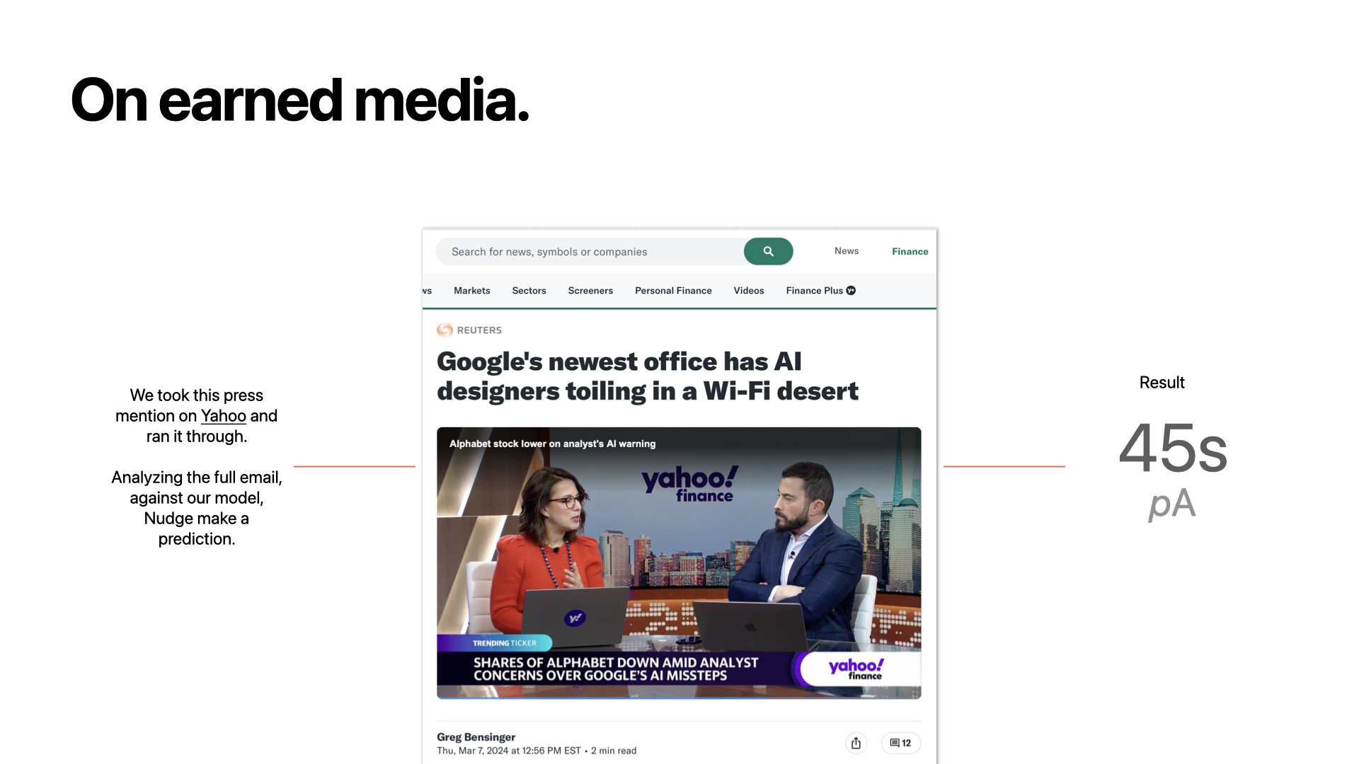 It started with a client going, can you give me data on this press mention? Without the use of tracking code. Which is what we would normally do. So without that, we thought what could we do? And that’s where machine learning can help. We built a model, that analyzes a url, records the meta data around it, that is impactful to the attention on that page. And it enables us to predict how much attention that pages gets.