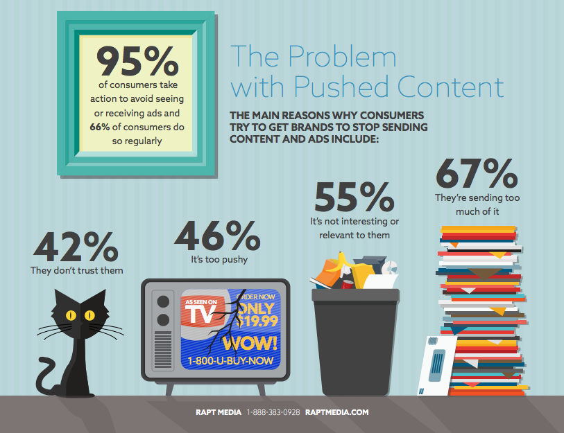 In the content marketing and native advertising world, many of us have long held the belief that interrupt advertising is going extinct. Yet many websites still rely on ad revenue to deliver content at no cost to its viewers. A recent study by Rapt Media found that 95 percent of consumers take action to avoid seeing or receiving ads.