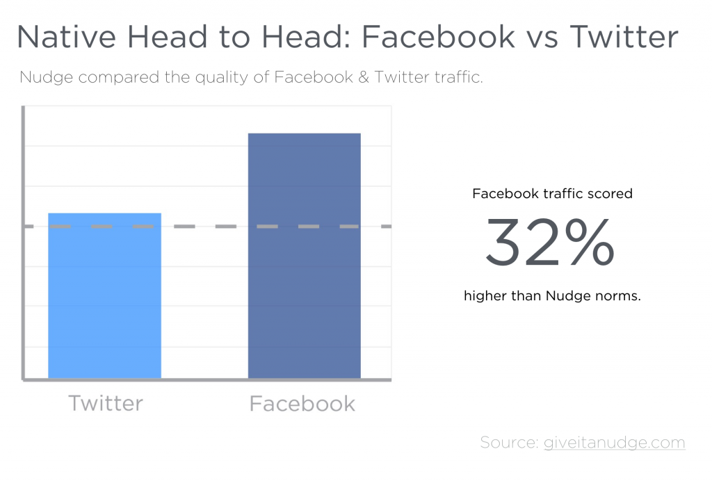 We benchmarked Twitter & Facebook traffic to native content against Nudge norms. And found that whilst Twitter was only marginally above the norms, Facebook was 32% higher. We are defining quality as based on the Attention Minutes that each source is driving at scale.