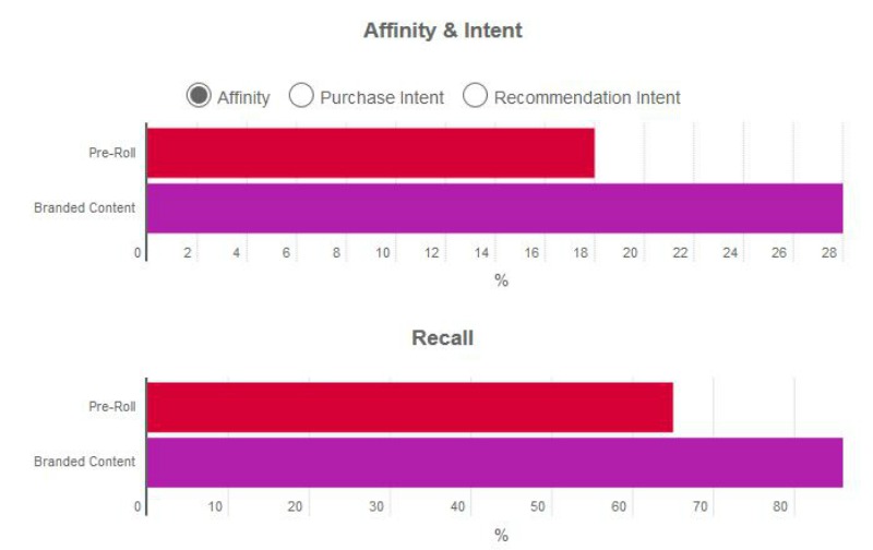 “When comparing the same brand marketed as both branded content and pre-roll ad, the branded content generated an average of 86% brand recall among viewers, compared with 65% from the pre-roll ad.”