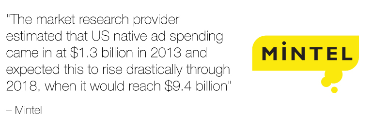 Native advertising is here to stay, based on August 2014 numbers from Mintel. The market research provider estimated that US native ad spending came in at $1.3 billion in 2013 and expected this to rise drastically through 2018, when it would reach $9.4 billion.