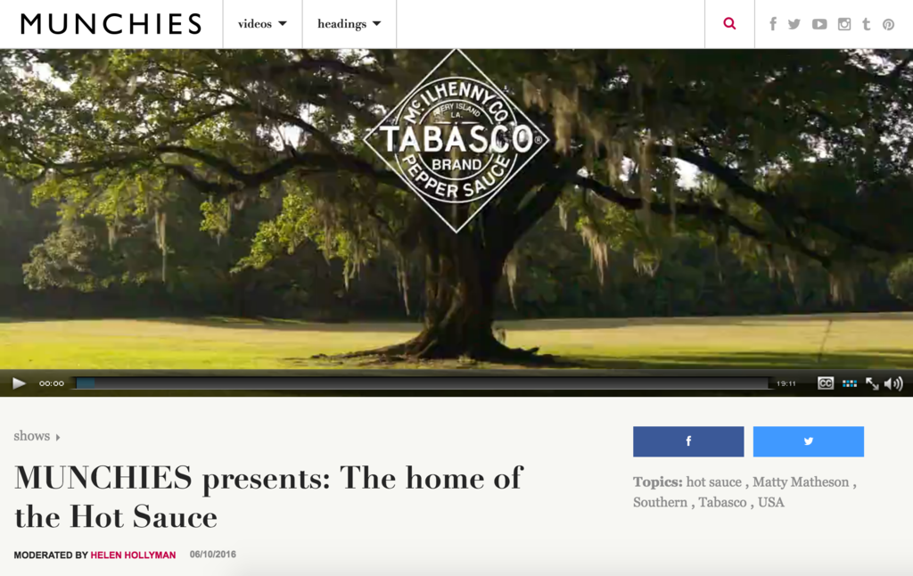 - Munchies Germany, a VICE property, created a solid piece of native content this month for Tabasco. It included a video and article that talked about Avery Island in Louisana (the home of Tabasco). Funny, on brand and a great connection between audience and product. Including an article with the video content (tip!) is also a great way of helping to increase your overall attention.