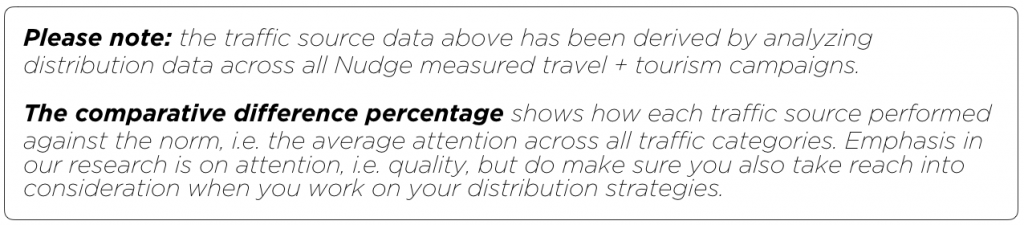 Attention is the time that a person is actively consuming the content. People have spent an average of 0.98 attention minutes on travel + tourism branded content, 123% higher than the average benchmark, across all categories, i.e. travel audiences are very engaged.