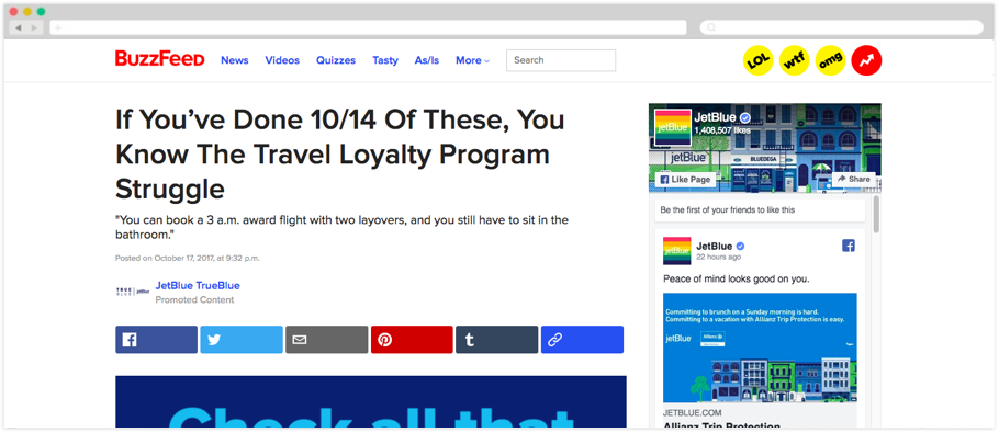 JetBlue on BuzzFeed: First out is a quiz (of course!). In this particular example, JetBlue + BuzzFeed have opted for a simple format, which invites the reader to interact with the content. JetBlue also educates their consumers about their loyalty program benefits in comparison to others. As we all know by having looked at the data, a quiz is the format that has the highest attention for travel brands. Well done, JetBlue.
