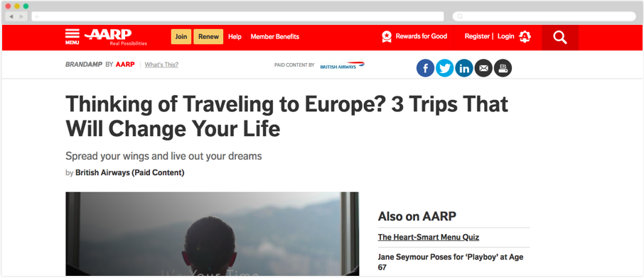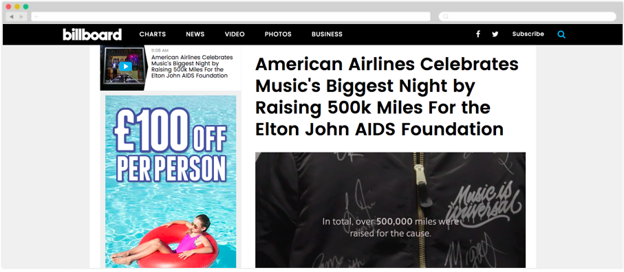 American Airlines on Billboard: This is a great piece by AA, where they celebrate Music’s Biggest Night by Raising 500k Miles For the Elton John AIDS Foundation. It’s also good to see that they’re using a video + article format, as we know it drives high attention and has in previous research (by Nudge) proven to increase conversions.