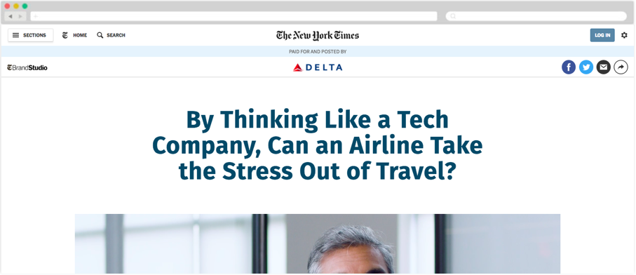 Delta on NYTimes: Everyone’s least favorite thing about traveling? The stress of it. Delta’s attacking it head on in this piece on the NYTimes, sharing how they’re reducing the stress in traveling by thinking and acting like a tech company. A great piece.