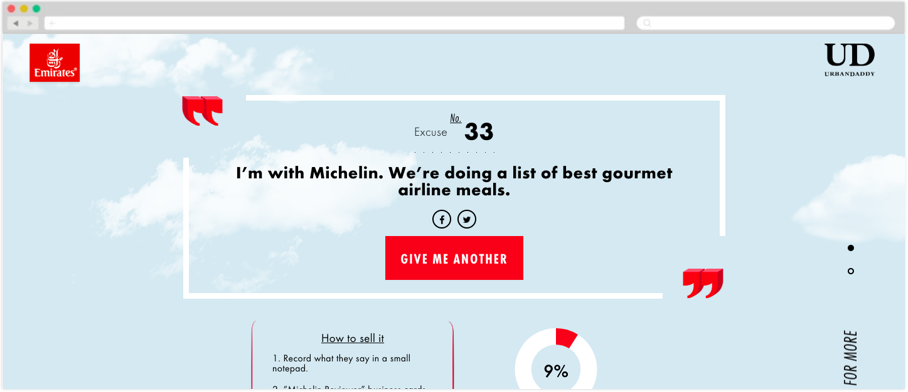 Emirates on UrbanDaddy: This is a clever piece by Emirates, which invites the reader to click a button to give them an excuse to upgrade their seat. It arms the reader with all the excuses necessary to elevate a flight. Fun, interactive and with a clear CTA.