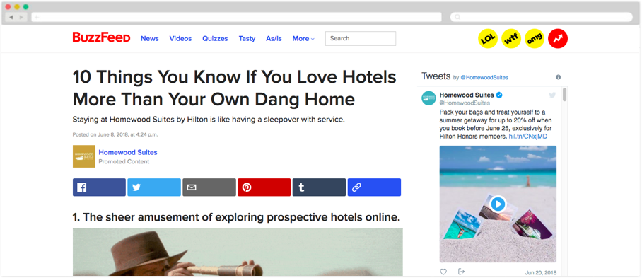 Hilton on BuzzFeed: A fun piece by Hilton. The gif + list format is BuzzFeed’s specialty and it works. The content is light-hearted and funny, whilst the brand itself is front and center.