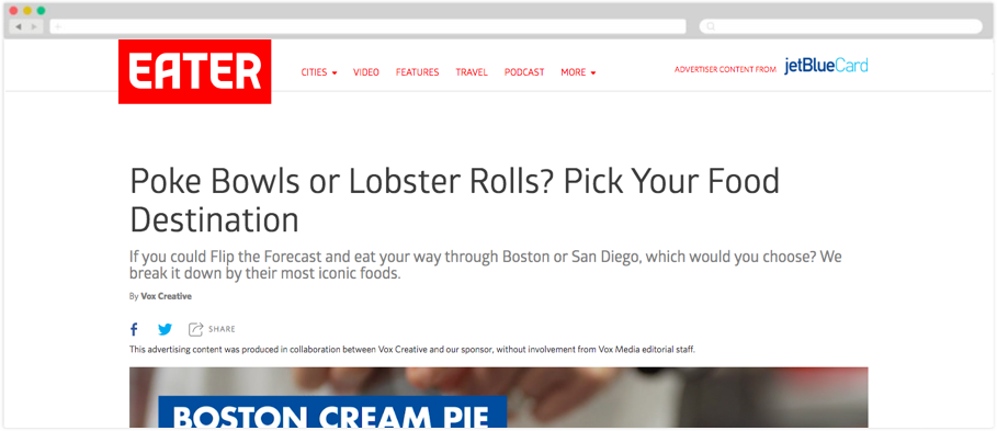 JetBlue on Eater: In this piece, JetBlue invites you along on a food journey across the US. We love the image slider, which enables you to compare iconic dishes across the country against one another. We ate 45 minutes ago, and now we’re hungry again… Great.
